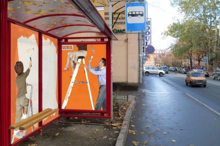 Брендирование автобусной остановки "OBI" для компании "ВолгоБалт Медиа"