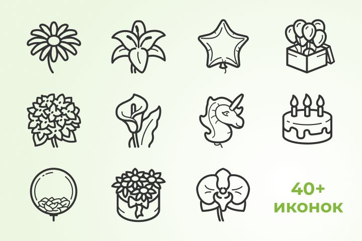 На основе оформления сайта и пожеланий клиента была выбрана стилистика и ракурс для будущих иконок цветов и подарков, а сами образы брались по фотографиям продукции и цветов.