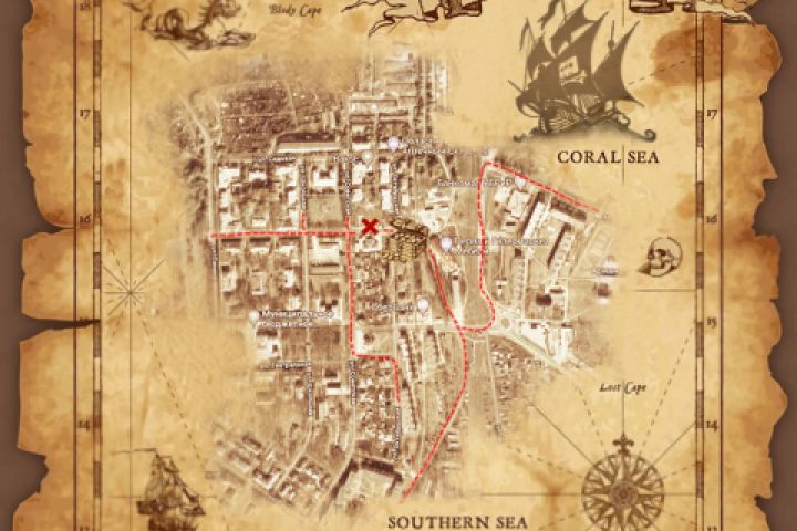 Карта местоположения для Паб-Кафе. Карта ландшафта с Google Карты переделана под пиратскую карту. Разработан в "Adobe Photoshop". Размер 3.5м х 2м
