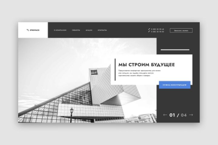 Сайт для строительной компании. Была выбрана строгая стилистика в черно-белых тонах,