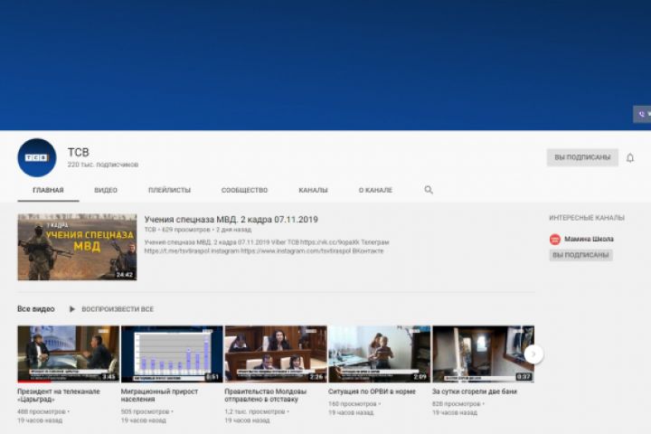 Самый крупный youtube в Приднестровье. Официальная страница телеканала ТСВ. Более 250 000 подписчиков, 100 млн просмотров
