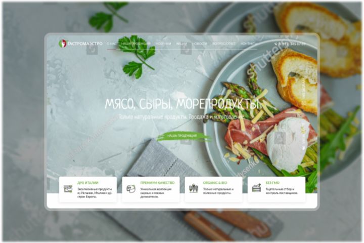 Разработка сайта для гастрономического магазина в Санкт-Петербурге. Изначально требовалось разработать Landing Page, который можно было бы в перспективе переработать в полноценный интернет-магазин. Для чего на стартовую страницу был выведен блок "Наша продукция" с переходом на страницы подкатегорий. А ниже, в блоке "Новинки", можно увидеть отображение карточек товаров на уровне каталога.