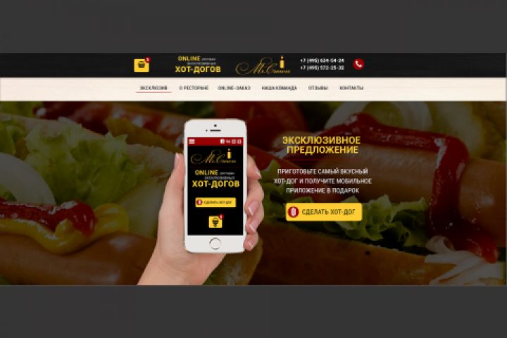 Разработка дизайна сайта (landing page) для online-ресторана эксклюзивных хот-догов "Mr.Crown" (десктоп, планшет и смартфон версии)