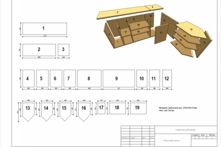 Чертеж тумбочки под обувь на заказ, по индивидуальным размерам.