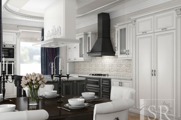 Дизайн кухни совмещенной с гостиной и столовой из проекта загородного дома в подмосковье