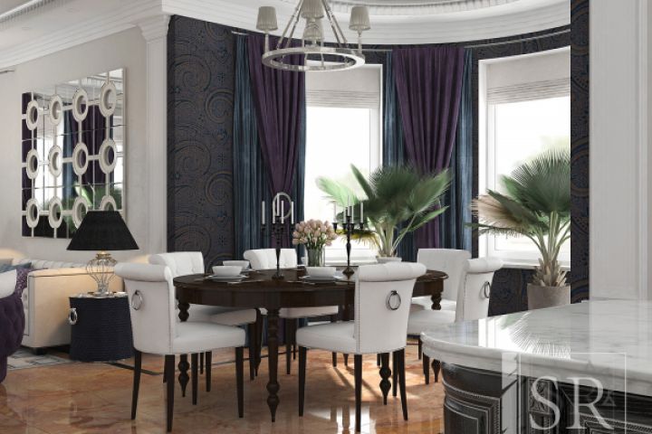 Дизайн столовой зоны совмещенной с кухней и гостиной из проекта загородного дома