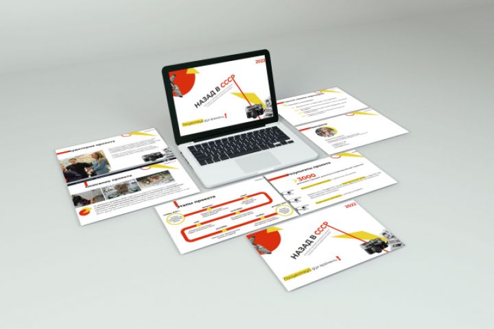 Цель презентации историко-просветительского проекта "Назад в СССР" - демонстрация концепции проекта для призыва присоединиться к проекту и стать партнером. Дизайн проекта выполнен с элементами советского стиля: простой шрифт (Montserrat), яркие, простые, контрастные цвета (желтый и красный), простые геометрические фигуры.