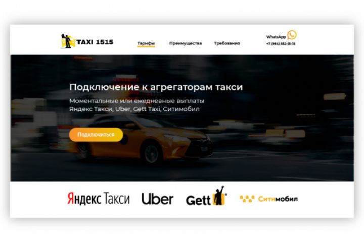 Сайт для компании, занимающийся подключением водителей к агрегаторам такси. На сайте указаны тарифы, преимущества компании, требования к водителям и форма для подачи online-заявки.