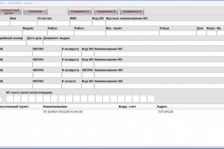 Программа загружает данные налоговых органов в формате xml, позволяет распечатывать заявления в налоговые органы, а так же сохранять введенные данные в формате xml и PDF.