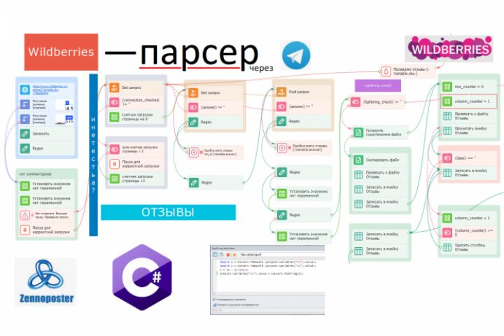 Написан шаблон управляемого через Telegram для программного SEO-комплекса ZennoPoster, позволяющий производить массовый парсинг, загрузку позиций из Вилбериса с заданных аккаунтов с определенных (закрепленных за аккаунтами) прокси с использованием также языка программирования Си шарп.
