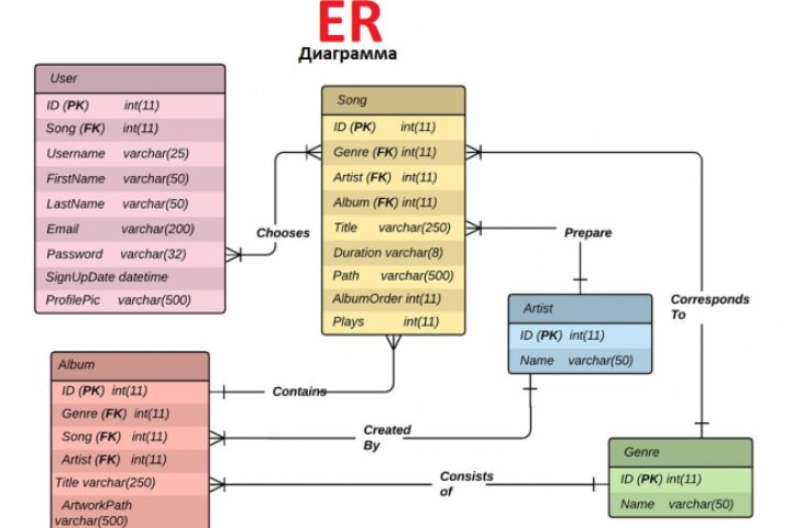 Спроектировал ER диаграмму в программе yEd Graph Editor для музыкального приложения
