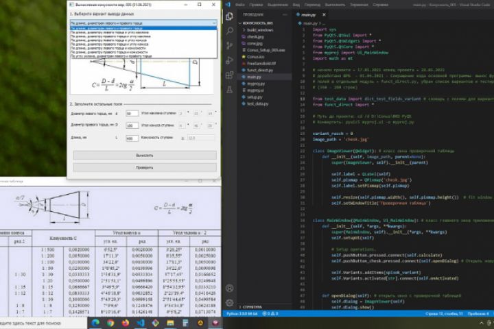 Это небольшое приложение было сделано по заказу для отдела контроля качества на предыдущей работе. По вариантам типа расчета оно вычисляет параметры конуса. Нужно для конструкторов и т.д.