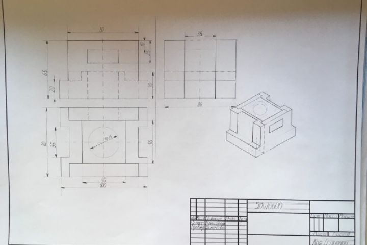Деталь во фронтальной, горизонтальной и профильной проекциях + изометрия.
