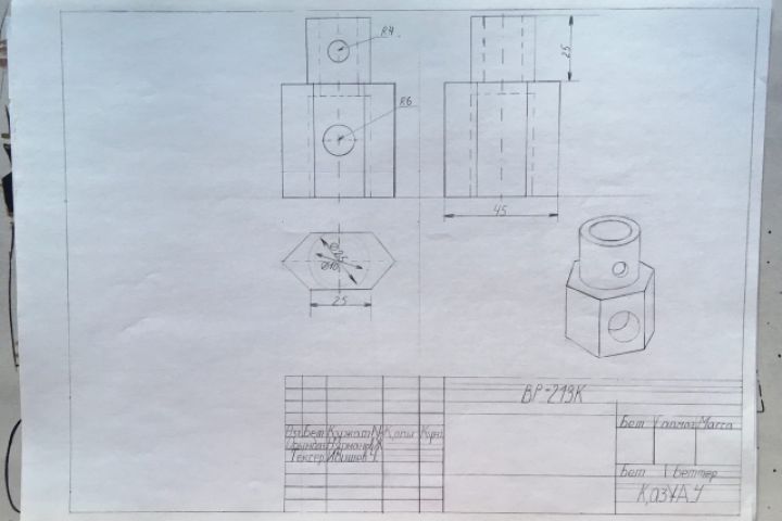 Деталь во фронтальной, горизонтальной и профильных проекциях + аксонометрия.