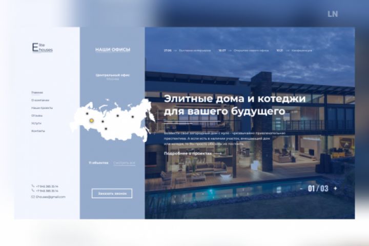 Требовалось разработать многостраничный сайт в строгом, минималистичном стиле. В меню сайта расположили логотип, вертикальное меню навигации. В виде фона первого экрана выбрали фотографию здания нейтральных тонов. Шрифтом для оффера установили Montserrat.