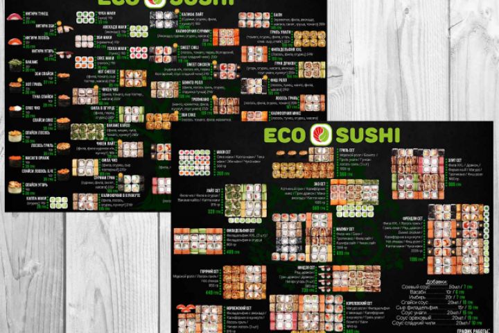 Дизайн основного меню и ретушь фото продукции для сети маркетов Эко суши.