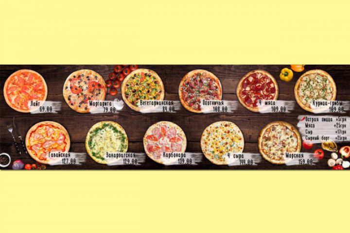 Большое меню для размещения над стойкой администратора. Ретушь фото продукции, добавление дополнительных элементов.