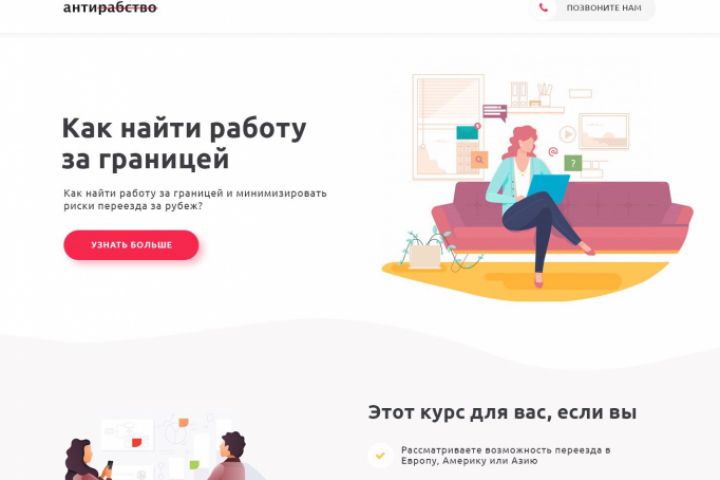 Главная страница под оду из услуг проекта "Антирабство" по организации работ в США и в Европе. Задача сайта - описать структуру услуги , расскрыть суть проекта и предоставиь бесплатный контент по потребностям пользователей курса.
