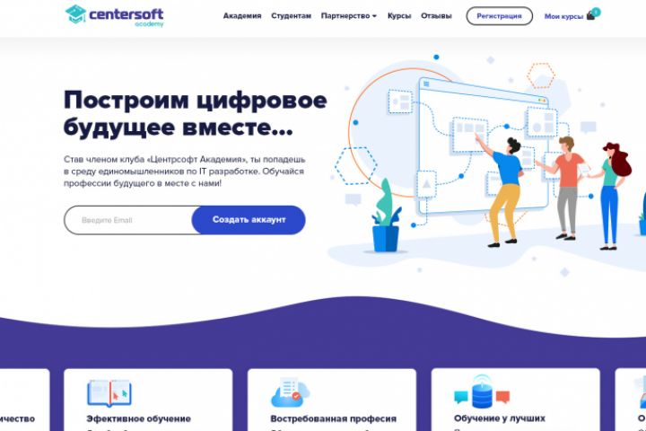 Разработка промо страницы для "Centersoft Academy" - онлайн обучающей платформы от компании "GC Centersoft" для автоматизации процессов учебных заведении и ВУЗ - ов Республики Казахстан. Платформа так же предоставляет возможность купить курсы по 1С онлайн и проходить обучение через облачный сервер от Cetrsoft.