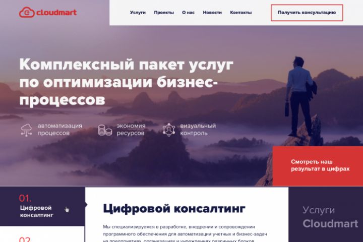 Промо сайт для компании Cloudmart. Компания предоставляет SAAS услуги по цифравизации и консалтингу бизнеса, базируясь на облачных технологиях.