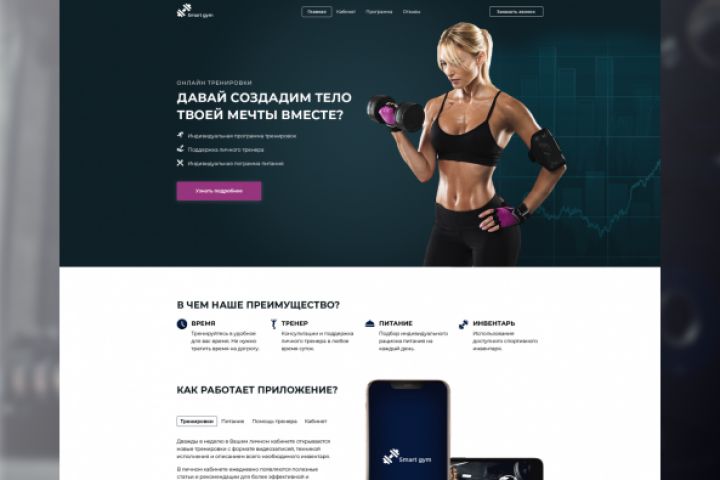 Задача страницы — продвижение мобильного приложения для онлайн тренировок.