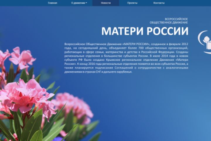 Сайт «Матери России» - официальный информационный сайт, посвященный Всероссийскому Общественному Движению. Целью сайта является предоставление актуальной информации, текущих событиях, предстоящих мероприятиях и проводимых проектах. Сайт прежде всего призван стать наставников и помочь в решении проблем, для этого на сайте реализована обратная связь и необходимый функционал.