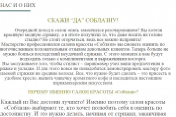 Мастерство профессионалов салона красоты «Соблазн» вы сможете оценить по многочисленным положительным отзывам довольных клиентов. Теперь больше не нужно бояться последствий неудачной стрижки. С этого момента к вам будут подходить только с комплиментами и выражениями восторга.