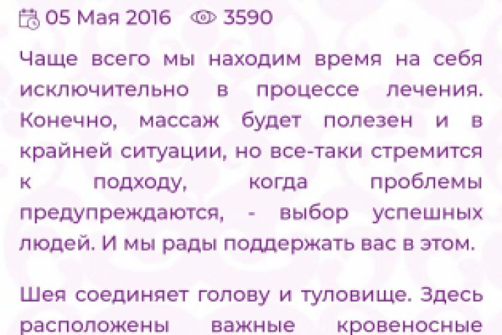 Статья в рамках наполнения раздела сайта "Полезное о массаже". Цель: подтверждение высоких компетенций персонала, объяснение потенциальным клиентам, почему регулярный массаж важен и полезен для здоровья и благополучия в целом, SEO-продвижение. Требования к материалу: уникальность 100%, увлекательность для читателей, достоверность информации.