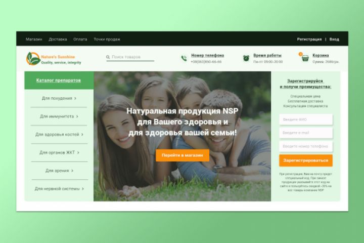 Многим наверняка известен американский бренд биодобавок NSP. Это, пожалуй обьемная работа была, поскольку клиент, диллер биодобавок попросил сделать как десктопную, так и лептопную и мобильную версию сайта с прототипом.