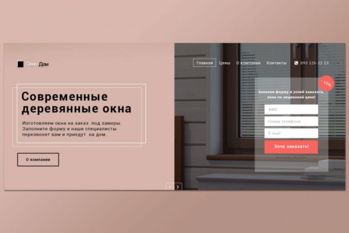 Компания занимается изготовлением деревянных окон. Была поставлена задача спроэктировать лэндинг в минималистическом строгом стиле с формой заказа на первой же странице.