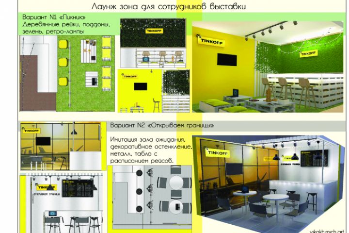 Два варианта визуализации лаунж зоны для конференции сотрудников банка, план расстановки мебели и 3д визуализция
