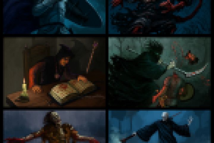 Задание: нужно было нарисовать некоторых персонажей для коллекционной карточной фэнтези игры (ККИ). Это персонажи, которые относятся к темной стороне колоды - смерть, черная магия. Представлена некоторая часть работы с такими персонажами как: Черный рыцарь, Умерщвление, Маг-некромант, Темный жнец, Зомби, Лич.