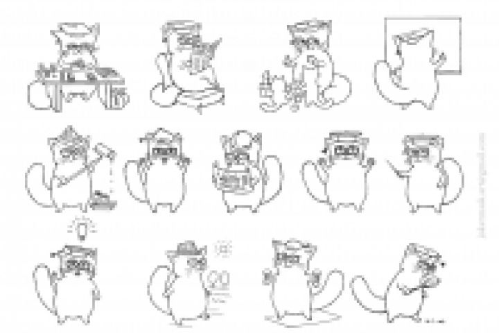 С этим персонажем нужно было нарисовать ряд котиков в мультяшном стиле, выполняющих какие-либо действия или испытывающих какие-либо эмоции. Например, кот в поиске, кот-спортсмен, кот-ремонтник, кот-строитель, кот читает газету, кот считает деньги и т.д.