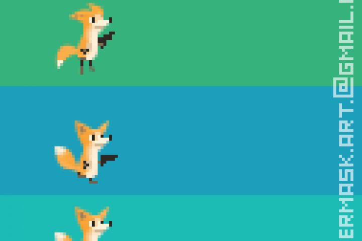 Задание: для компьютерной игры нужно было разработать персонажа и сделать его анимацию, нарисовать ключевые кадры. Персонаж - лисенок с пистолетом.