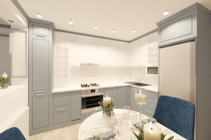 Современная классика в интерьере, спокойные оттенки дымчато серо-голубого с белым . Кухня объединённая с балконом.