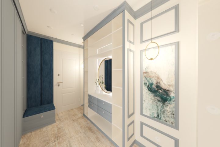 Современная классика в интерьере, спокойные оттенки дымчато серо-голубого с белым . Прихожая.