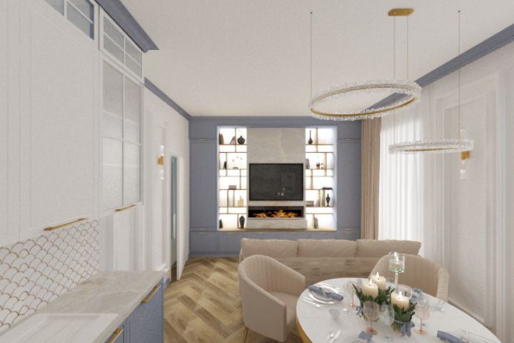 Нэоклассика в интерьере, спокойные оттенки дымчато серо-голубого с белым + элементы из латуни.