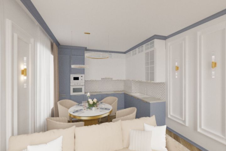 Нэоклассика в интерьере, спокойные оттенки дымчато серо-голубого с белым + элементы из латуни.