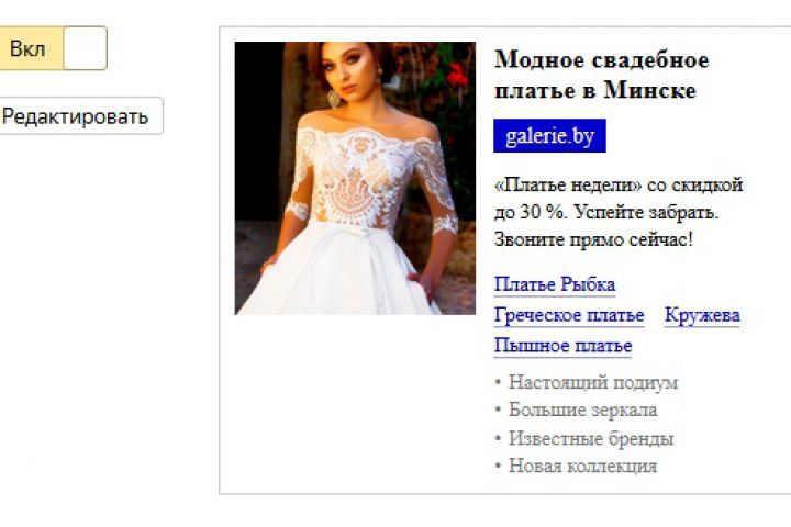 К нам обратился руководитель салона свадебного платья. Это было новое направление его бизнеса. С помощью контекстной рекламы он хотел протестировать нишу. А в дальнейшем заняться продвижением бренда.