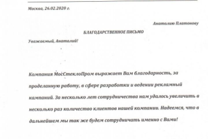 Благодарственное письмо от строительной компании.