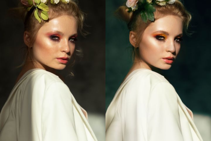 • Ретушь кожи методом частотного разложения; • Пластика; • Проработка фона; • Замена цветов на обруче.
