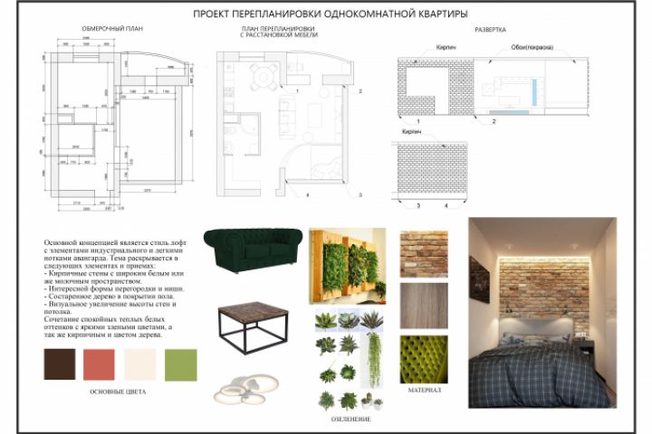 Выполнение чертежей с опорой на ТЗ. Разработка интерьера 1-комнатной квартиры с планами пола, потолка, света и расстановкой мебели. Подбор фактур, текстур, цветовых сочетаний и элементов интерьера.