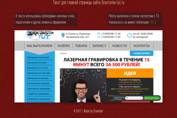 Текст для главной страницы (а также всех категорий) сайта компании, предлагающей услуги лазерной гравировки (gravirovka-tut.ru). Текст опубликован на сайте в 2017 году и используется по сей день. Выполняет необходимые SEO-задачи, касательно продвижения сайта по определённым ключевым запросам.