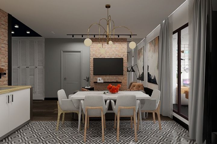 Необходимо было разработать объединенное пространсво кухни-гостинной. Заказчикам хотелось кирпич, но без явного лофта, ближе к неоклассическому стилю.