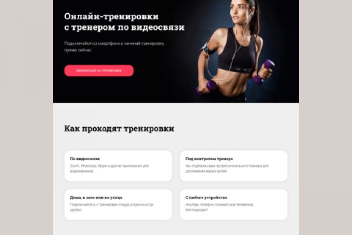 На лендинге описаны тренировки с возможностью купить абонемент и записаться как на пробное занятие, так и на занятия по абонементу.