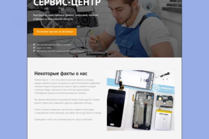 Сайт-визитка для сервиса по ремонту цифровой техники в г. Балашиха. Описание услуг, преимущества, контакты.