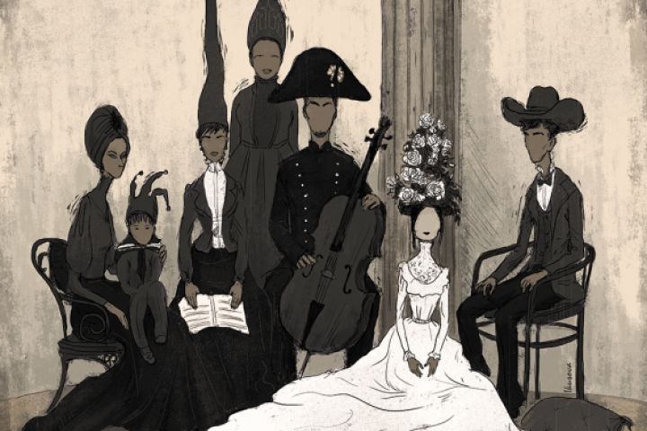 Семейное фото в нелепых шляпах, виолончельный ансамбль