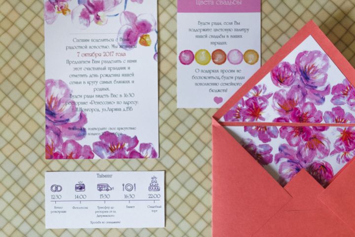 Разработка свадебного приглашения, тайминга, подарочного конверта, баннера (не указан на фото). Отрисовка цветов от руки акварелью под желание заказчика.