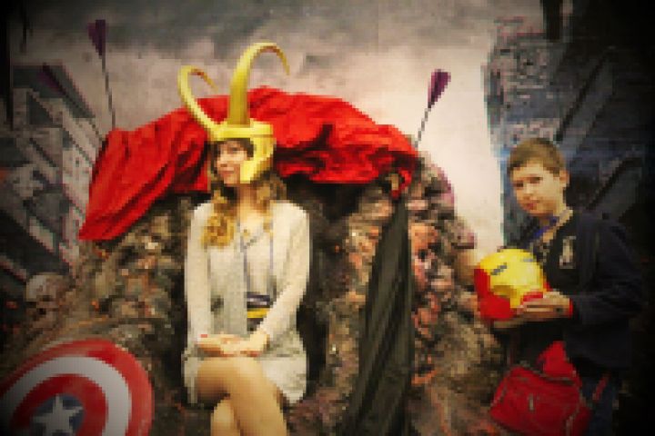 шлем Локи, шлем Железного Человека и сама "гора", на которой сидит девушка.
