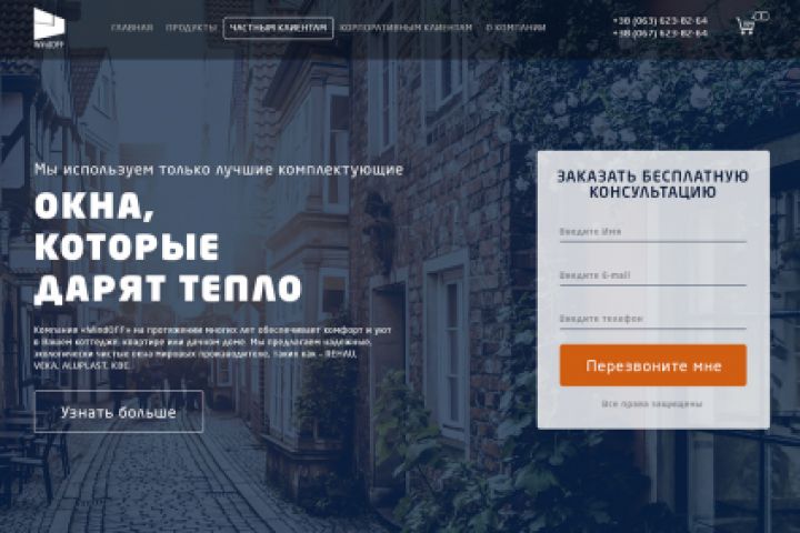 Разработка сайта в формате Landing Page для фирмы - производителя окон WindOFF. Стиль выбран строгий, простой, но современный и лаконичный.